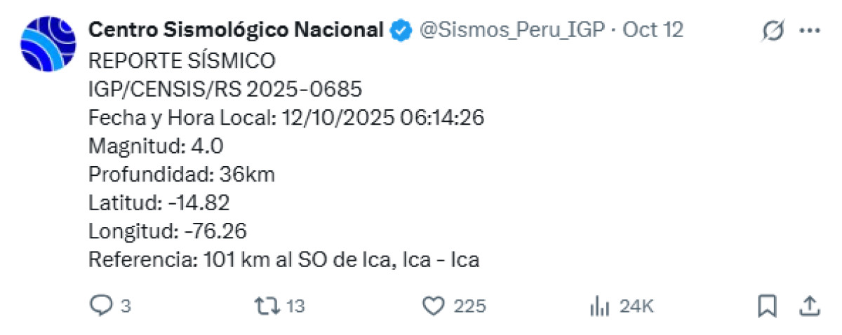 Un temblor de magnitud 4,0 se registró a las 6:14 a. m. a 53 kilómetros al suroeste de Ica. El temblor del 12 de octubre de 2025, se registró a una profundidad de 36 kilómetros, según informó el Instituto Geofísico del Perú (IGP) vía Twitter.