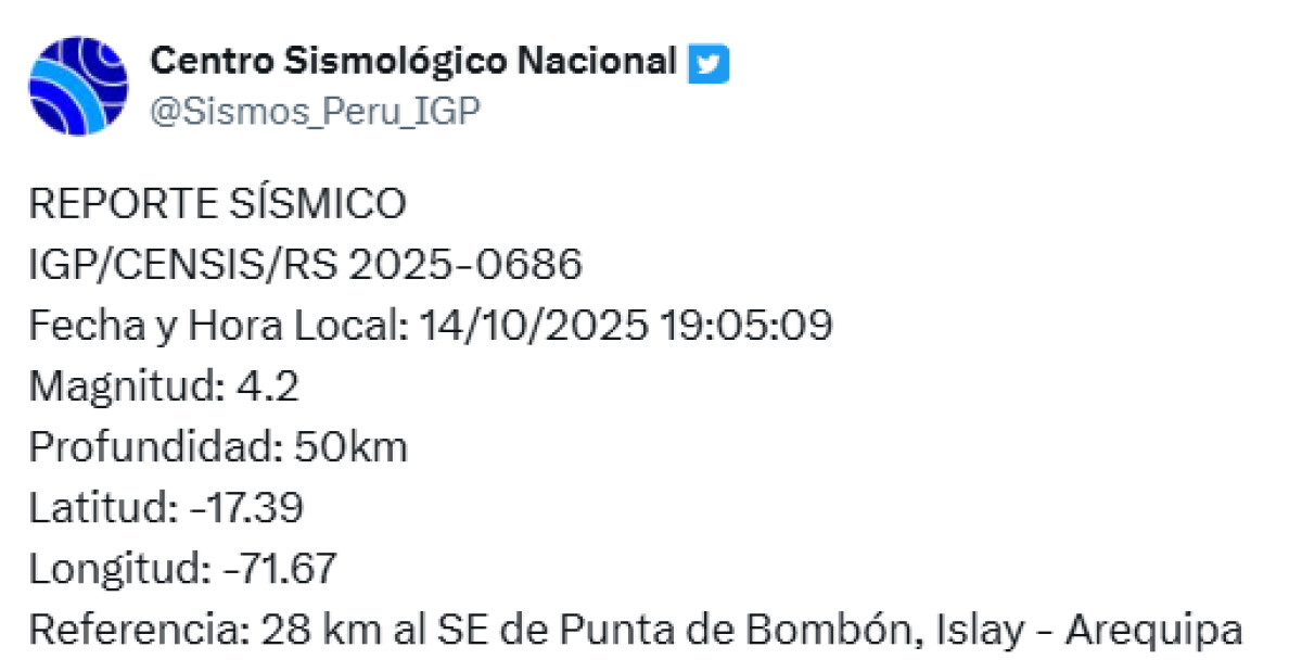 Un temblor de magnitud 4,2 se registró a las 7:05 a. m. a 28 kilómetros al sureste de Punta de Bombón, Arequipa. El temblor del 14 de octubre de 2025, se registró a una profundidad de 50 kilómetros, según informó el Instituto Geofísico del Perú (IGP) vía Twitter.