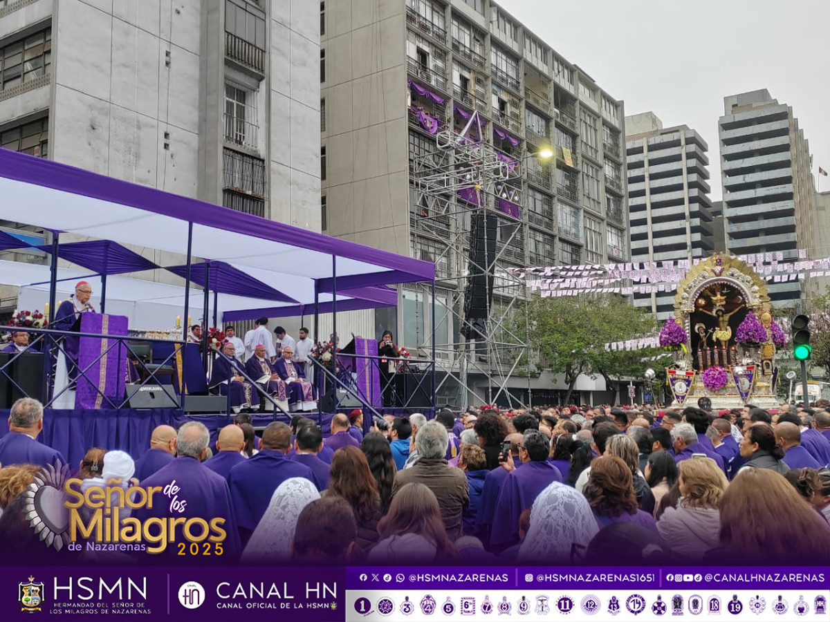 Tras la Santa Misa, el anda del Señor de los Milagros reinicia su recorrido por la cuadra 3 de la av. Tacna. Luego seguirá por el jirón Ica y el jirón de la Unión, con ingreso a la Plaza Mayor de Lima, donde se rendirán homenajes por parte de la Municipalidad Metropolitana, el Palacio de Gobierno y el Palacio Arzobispal.