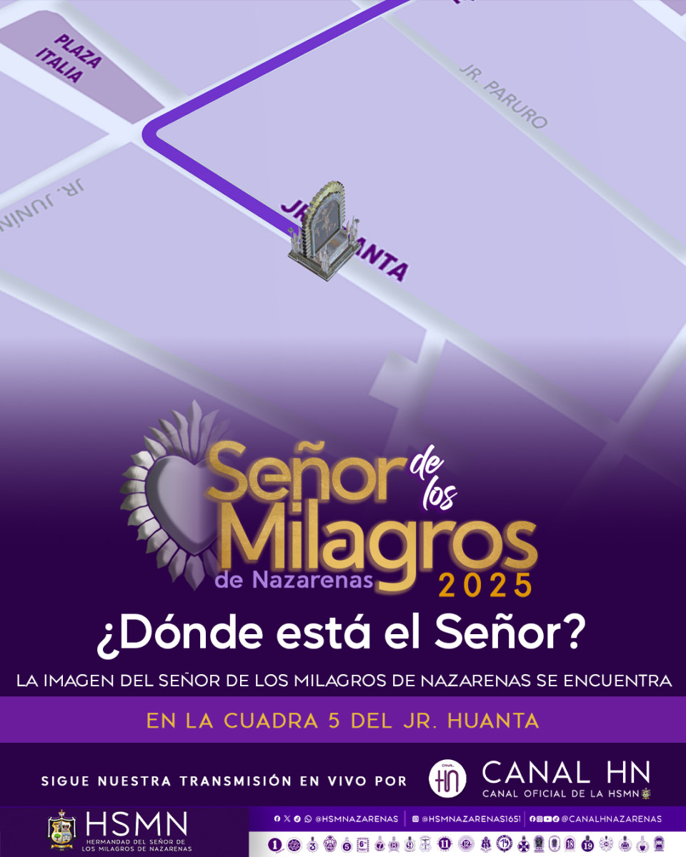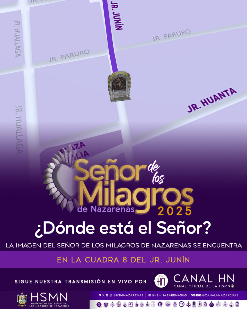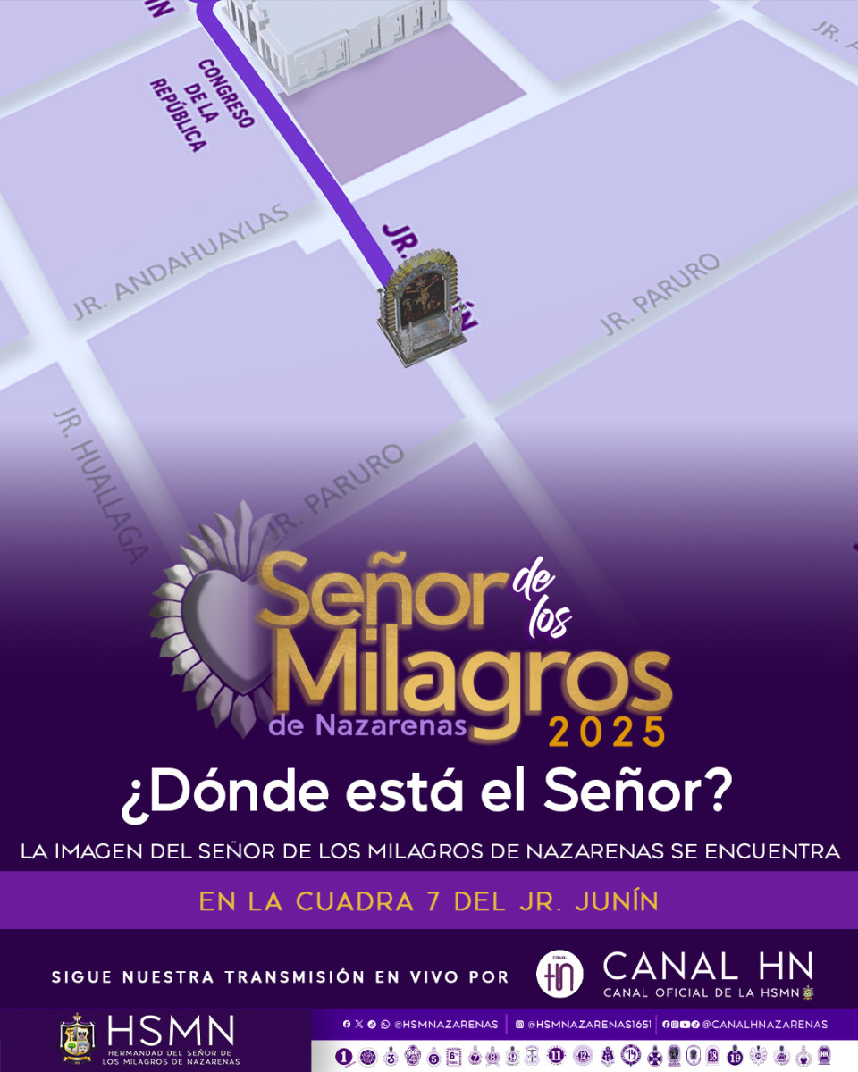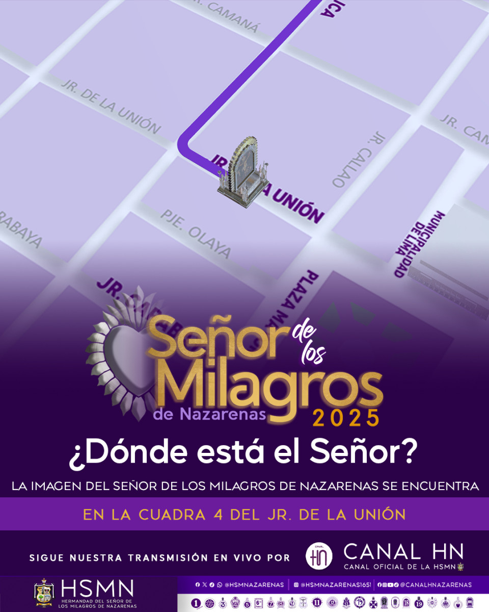 Si no puedes acudir presencialmente a la procesión del Señor de los Milagros, puedes seguir la transmisión en vivo a través de Nazarenas TV y América TV. También está disponible en Canal HN, el sitio web oficial de la Hermandad del Señor de los Milagros de Nazarenas y las plataformas digitales del Arzobispado de Lima.
