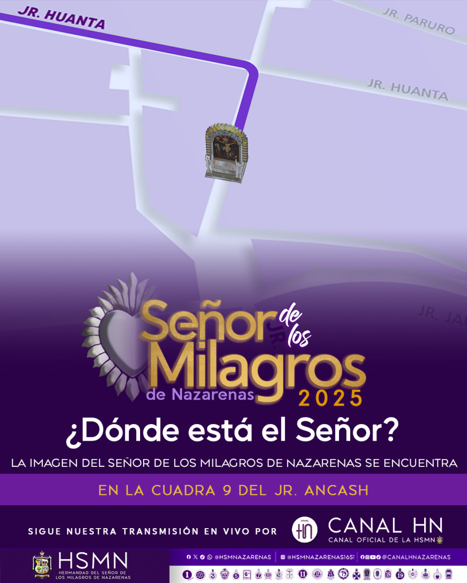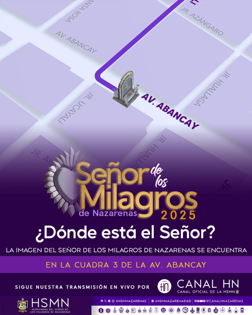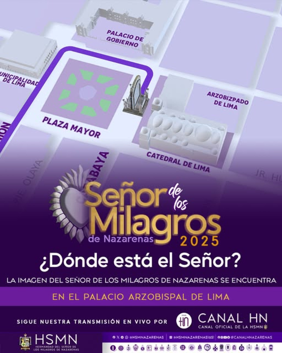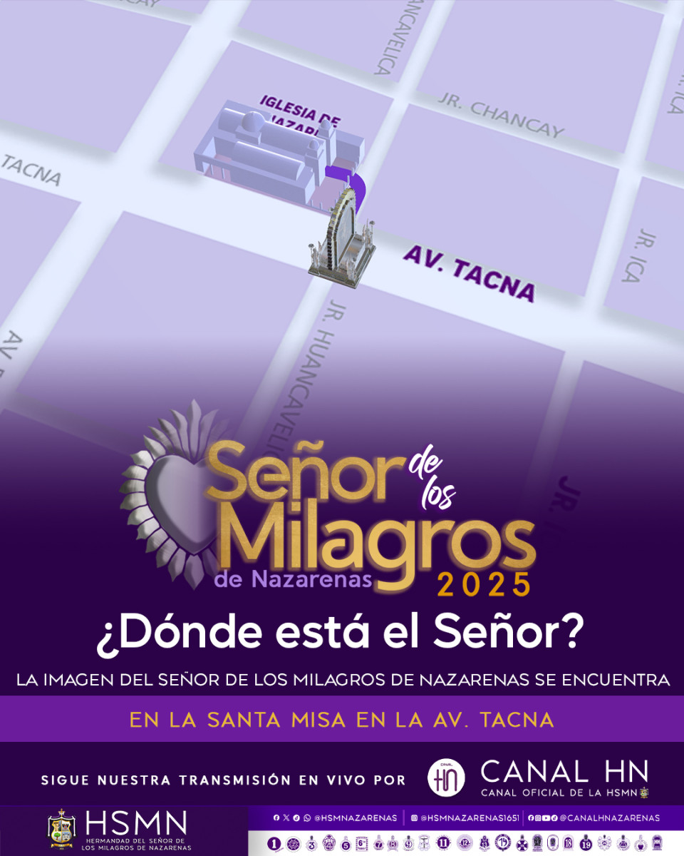 Si no puedes acudir presencialmente a la procesión del Señor de los Milagros, puedes seguir la transmisión en vivo a través de Nazarenas TV y América TV. También está disponible en Canal HN, el sitio web oficial de la Hermandad del Señor de los Milagros de Nazarenas y las plataformas digitales del Arzobispado de Lima.