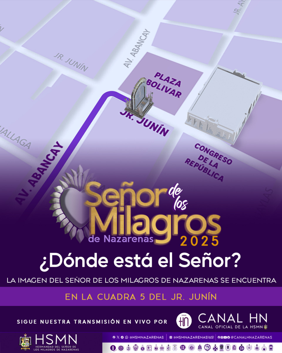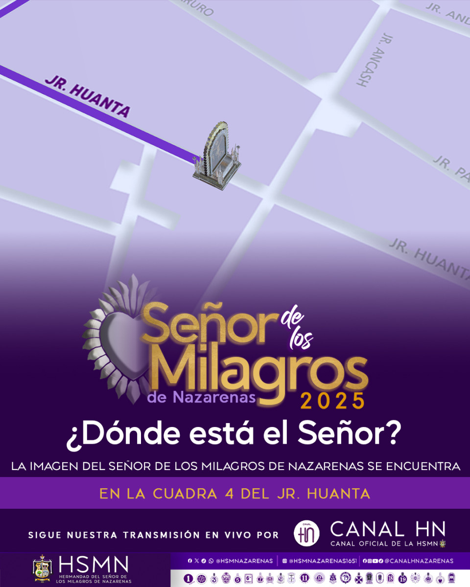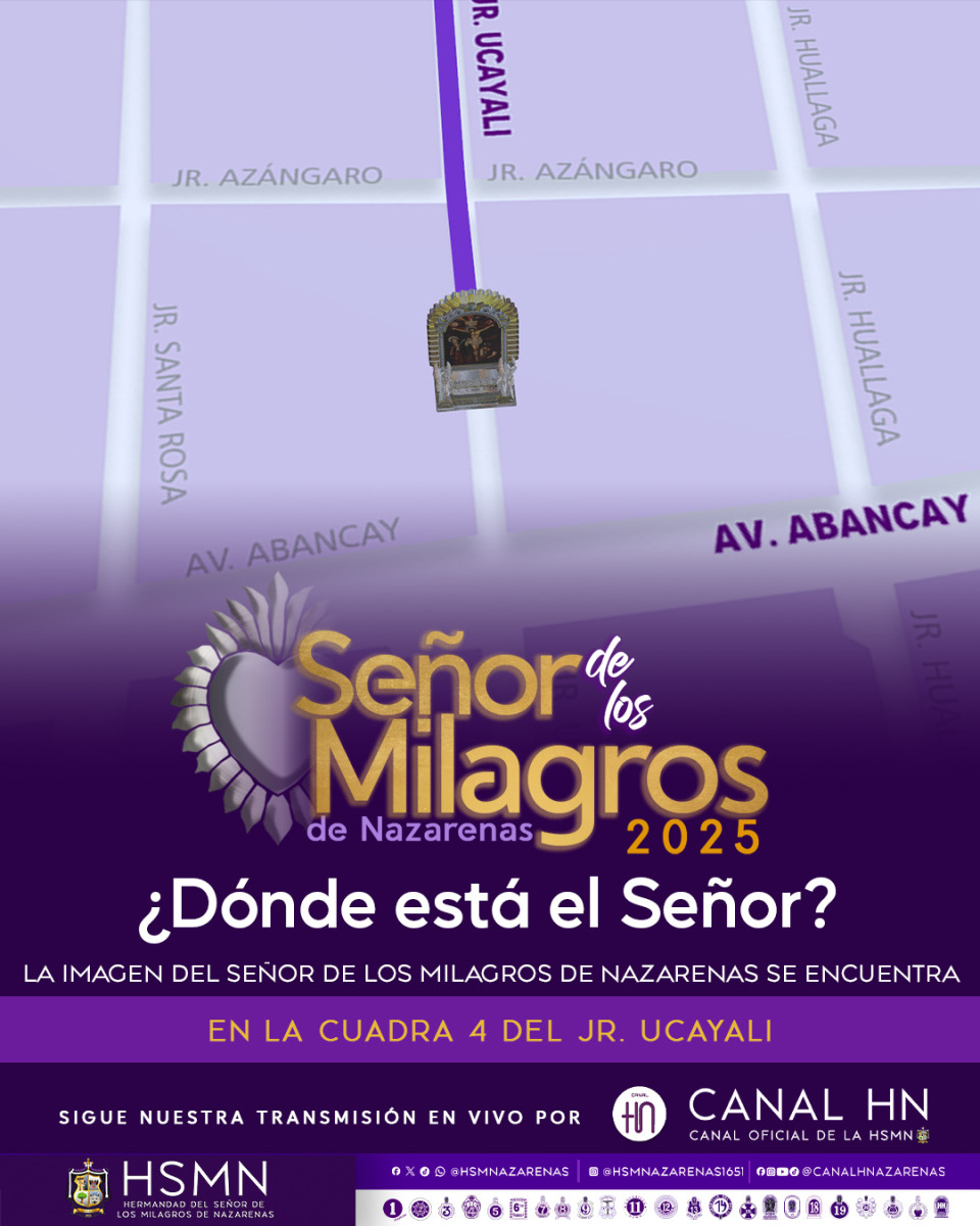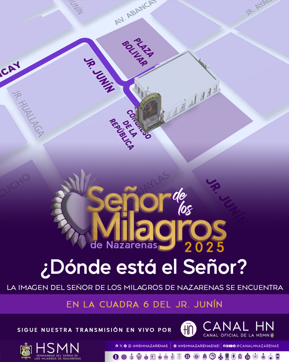 Si no puedes acudir presencialmente a la procesión del Señor de los Milagros, puedes seguir la transmisión en vivo a través de Nazarenas TV y América TV. También está disponible en Canal HN, el sitio web oficial de la Hermandad del Señor de los Milagros de Nazarenas y las plataformas digitales del Arzobispado de Lima.