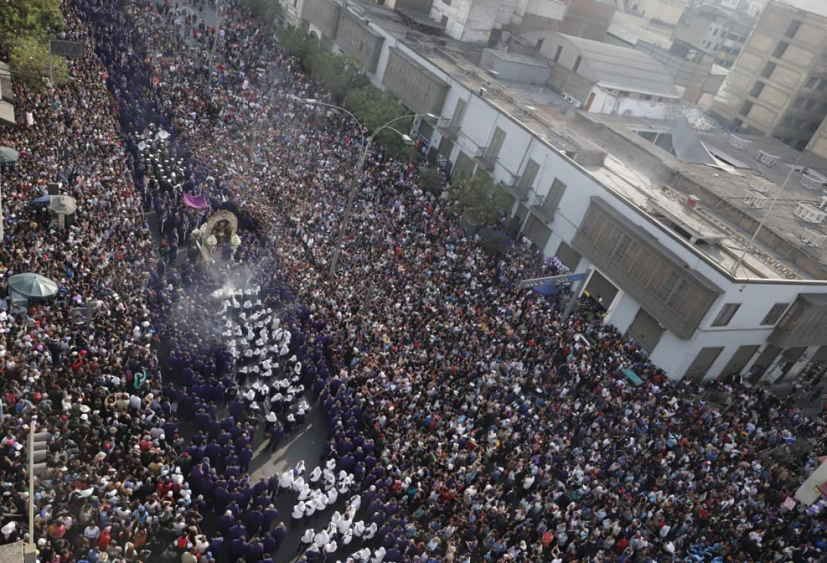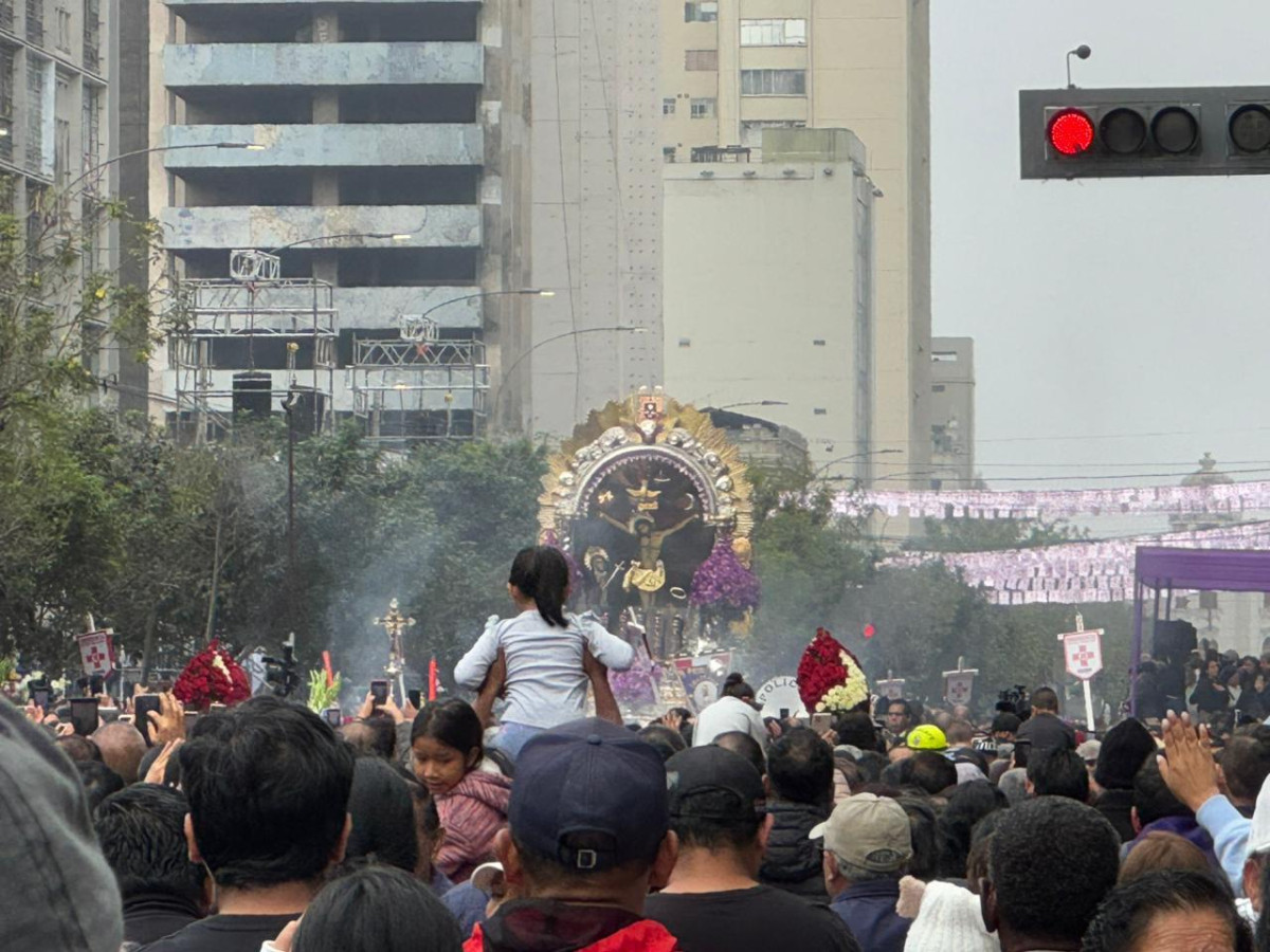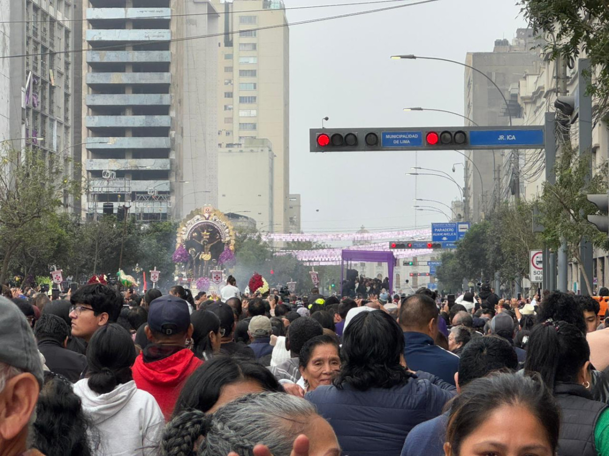 Desde las 5:30 pm, la procesión del Señor de los Milagros se encuentra en la avenida Abancay. Cientos de devotos continúan congregados para acompañar a la imagen del Cristo Morado en las calles del Centro de Lima.