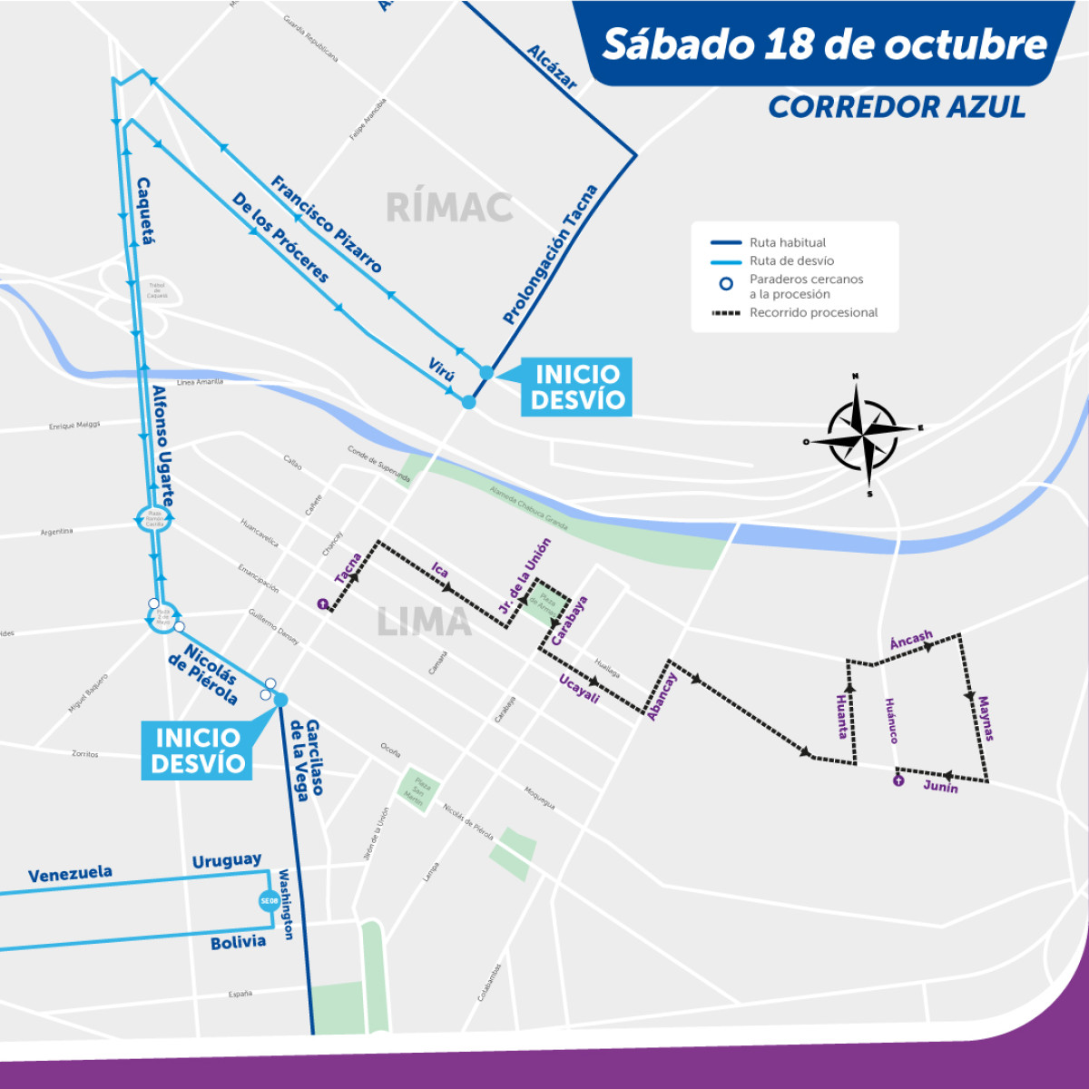 Los buses del Corredor Azul modificarán su ruta habitual, circulando por las avenidas Prolongación Tacna, Francisco Pizarro, Morro de Arica, Caquetá, Alfonso Ugarte (Plaza Ramón Castilla y Dos de Mayo) y Nicolás de Piérola. Posteriormente, continuarán su trayecto por la avenida Garcilaso de la Vega, con destino a Barranco y Miraflores. Además, el servicio extraordinario 08 se limitará a llegar hasta el jirón Washington, reanudando su recorrido a través de las avenidas Uruguay y Venezuela.