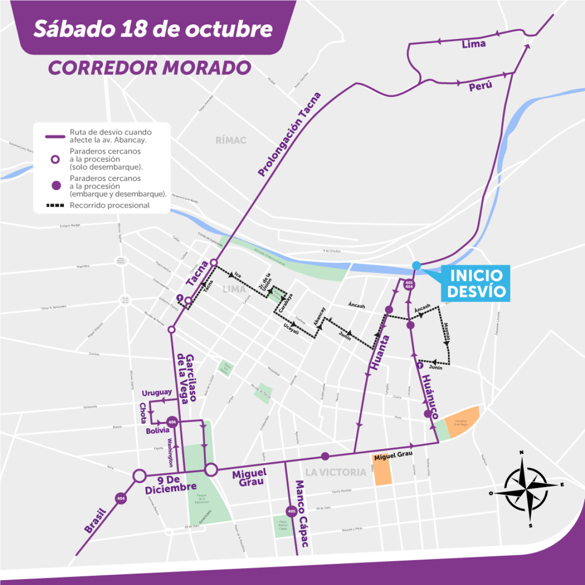 Durante el recorrido de la procesión por la avenida Abancay, los servicios del Corredor Morado 404 y 405 modificarán su ruta, transitando por el jirón Huanta y la avenida Miguel Grau en dirección a Magdalena y San Isidro. En sentido opuesto, estos buses circularán por la avenida Miguel Grau y el jirón Huánuco. Por su parte, el servicio 406 operará a lo largo de las avenidas Tacna y Garcilaso de la Vega. Asimismo, el servicio 412 del corredor Morado limitará su recorrido hasta el jirón Virú con Prolongación Tacna, en el distrito del Rímac.