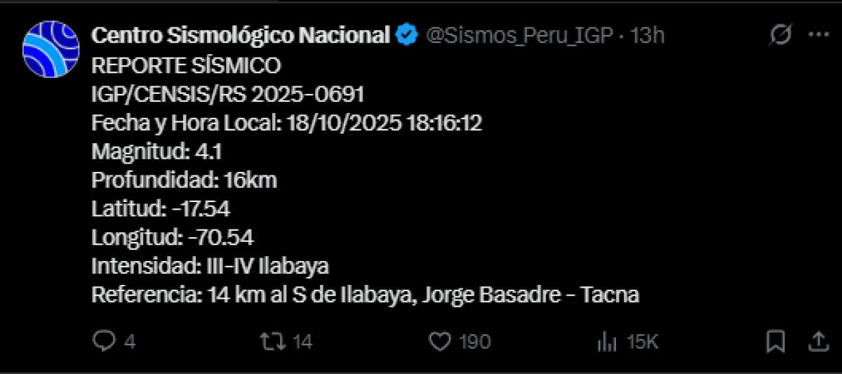 Un temblor de magnitud 4,1 se registró a las 18:16 a. m. a 16 kilómetros al sur de Ilabaya, Jorge Basadre, Tacna. El temblor del 19 de octubre de 2025, se registró a una profundidad de 16 kilómetros, según informó el Instituto Geofísico del Perú (IGP) vía Twitter. Recuerda tener siempre lista una mochila de emergencia para estar preparado ante un desastre natural.