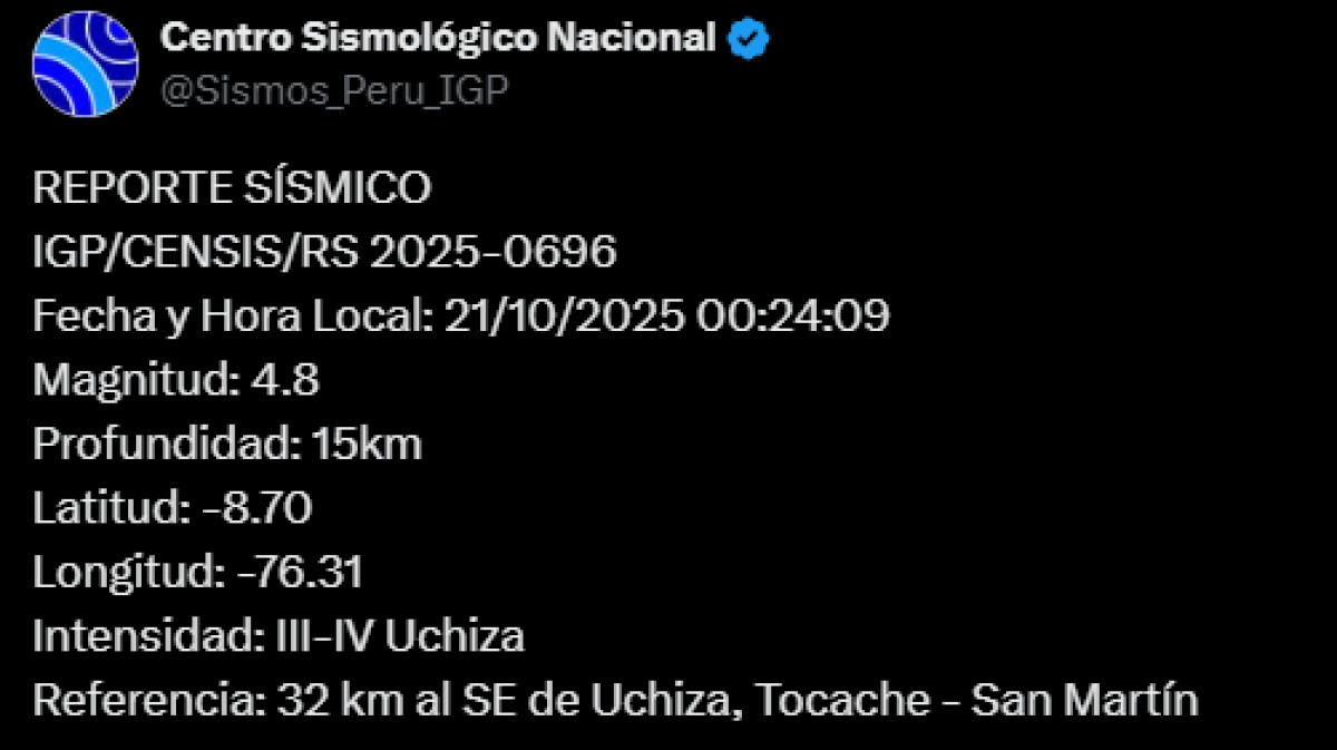 A las 00:24 a.m. de este martes 21 de octubre, San Martín registró un sismo de magnitud 4,8. El epicentro se dio a 32 km al sureste de Uchiza, Tocache, según el Centro Sismológico Nacional.