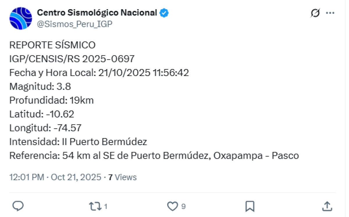 A las 11.56 a.m. de este martes 21 de octubre, Pasco registró un sismo de magnitud 3,8. El epicentro se dio a 54 km al sureste de Puerto Bermúdez, según el Centro Sismológico Nacional.