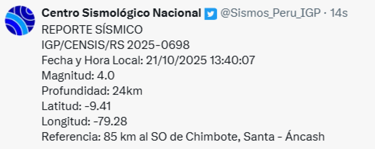 Un temblor de magnitud 4,0 se registró a las 01:40 p. m. a 53 kilómetros al suroeste de Chimbote, Áncash. El temblor del 21 de octubre de 2025, se registró a una profundidad de 24 kilómetros, según informó el Instituto Geofísico del Perú (IGP) vía Twitter. Recuerda tener siempre lista una mochila de emergencia para estar preparado ante un desastre natural.