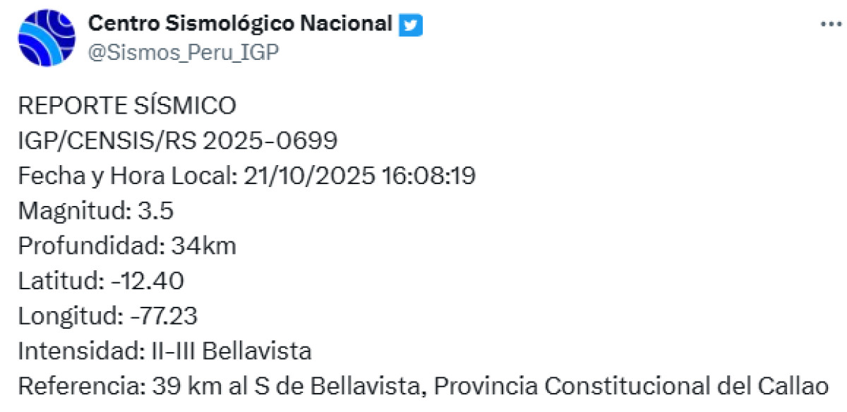 Un temblor de magnitud 3,5 se registró a las 04:08 p. m. a 39 kilómetros al sur de Bellavista, Callao. El temblor del 21 de octubre de 2025, se registró a una profundidad de 34 kilómetros, según informó el Instituto Geofísico del Perú (IGP) vía Twitter. Recuerda tener siempre lista una mochila de emergencia para estar preparado ante un desastre natural.