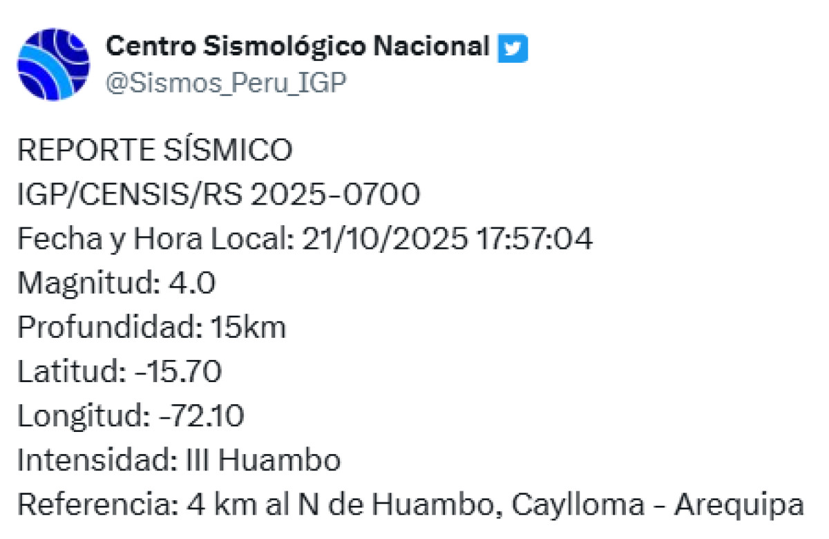 Un temblor de magnitud 4,0 se registró a las 05:57 p. m. a 4 kilómetros al norte de Huambo, Arequipa. El temblor del 21 de octubre de 2025, se registró a una profundidad de 15 kilómetros, según informó el Instituto Geofísico del Perú (IGP) vía Twitter. Recuerda tener siempre lista una mochila de emergencia para estar preparado ante un desastre natural.