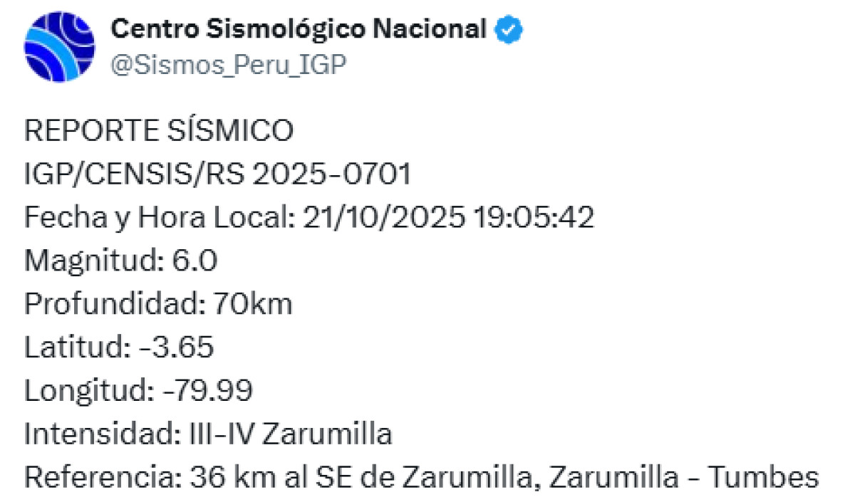 Un fuerte temblor de magnitud 6,0 se registró a las 07:05 p. m. a 36 kilómetros al sureste de Zarumilla, Tumbes. El temblor del 21 de octubre de 2025, se registró a una profundidad de 70 kilómetros, según informó el Instituto Geofísico del Perú (IGP) vía Twitter. Recuerda tener siempre lista una mochila de emergencia para estar preparado ante un desastre natural.