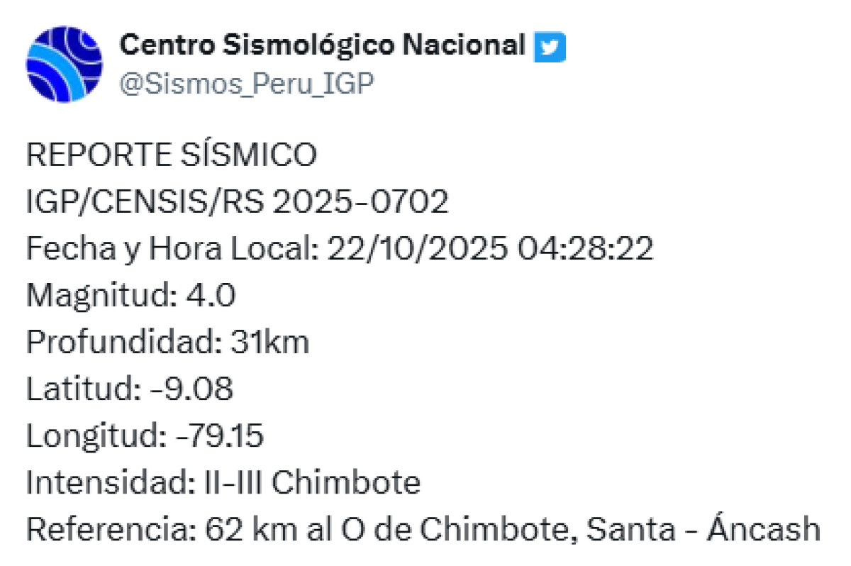 Se registró un temblor de magnitud 4,0 en Ancash HOY, 22 de octubre, según IGP