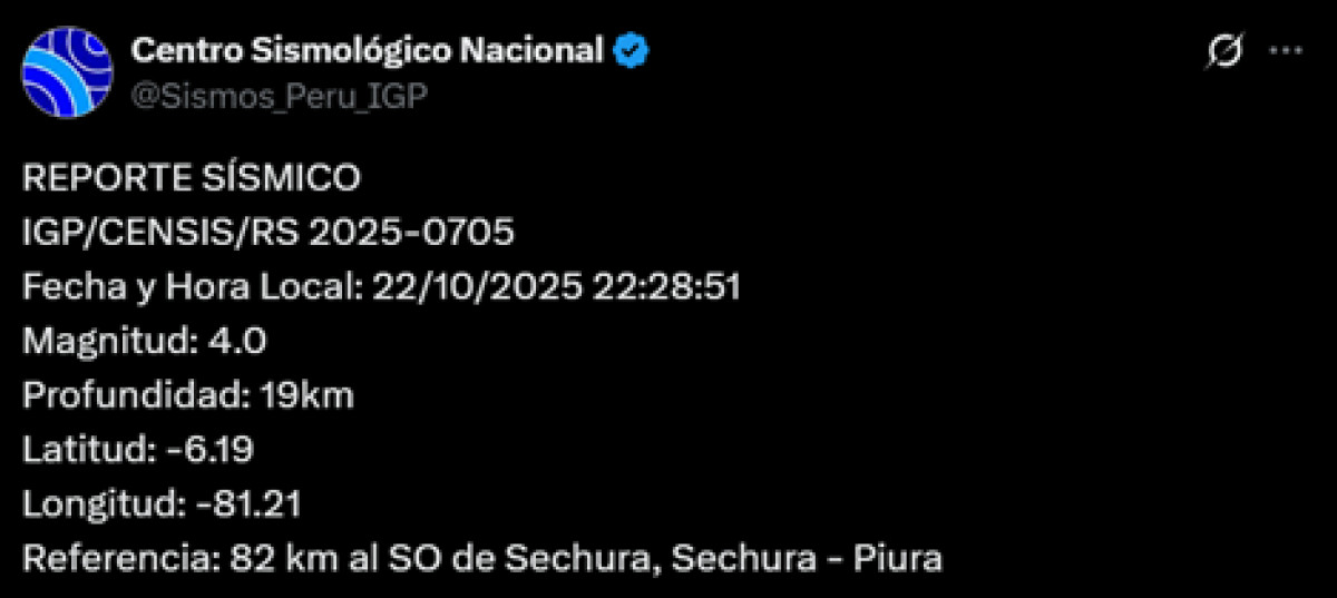 A las 22:28 p.m. de este miércoles 22 de octubre, la ciudad de Piura registró un sismo de magnitud 4,0. El epicentro se dio a 82 km al suroeste de Sechura, Sechura, con una profundidad de 19 kilómetros, según el Centro Sismológico Nacional.