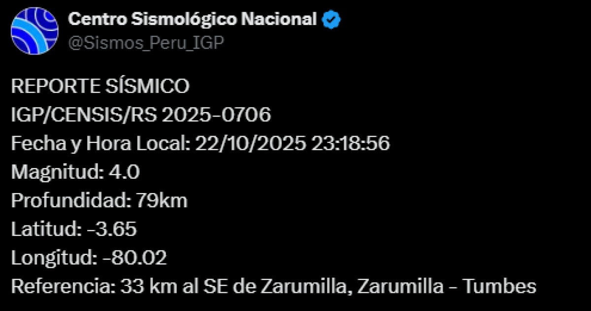 A las 23:18 p.m. de este miércoles 22 de octubre, la ciudad de Tumbes registró un sismo de magnitud 4,0. El epicentro se dio a 33 km al sureste de Zarumilla, Zarumilla, con una profundidad de 79 kilómetros, según el Centro Sismológico Nacional.