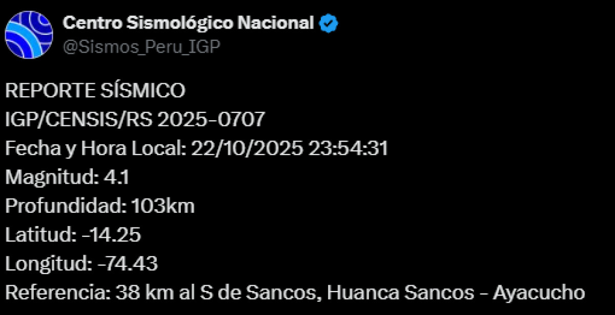 A las 23:54 p.m. de este miércoles 22 de octubre, Ayacucho registró un sismo de magnitud 4,1. El epicentro se dio a 38 km al sur de Sancos, Huanca Sancos, con una profundidad de 103 kilómetros, según el Centro Sismológico Nacional.