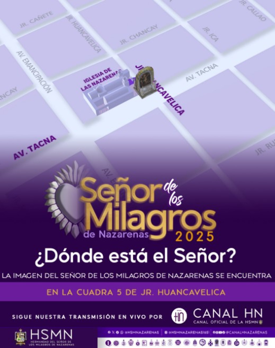 Este martes 28 de octubre, la quinta procesión del Señor de los Milagros podrá ser vista a través de la plataforma Nazarenas TV visitando el siguiente ENLACE. Cabe precisar que la transmisión abarcará todo el evento, el cual empezará a las 6 a. m.