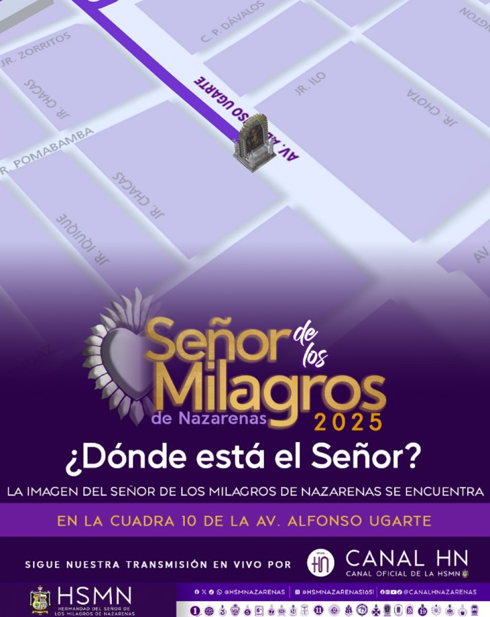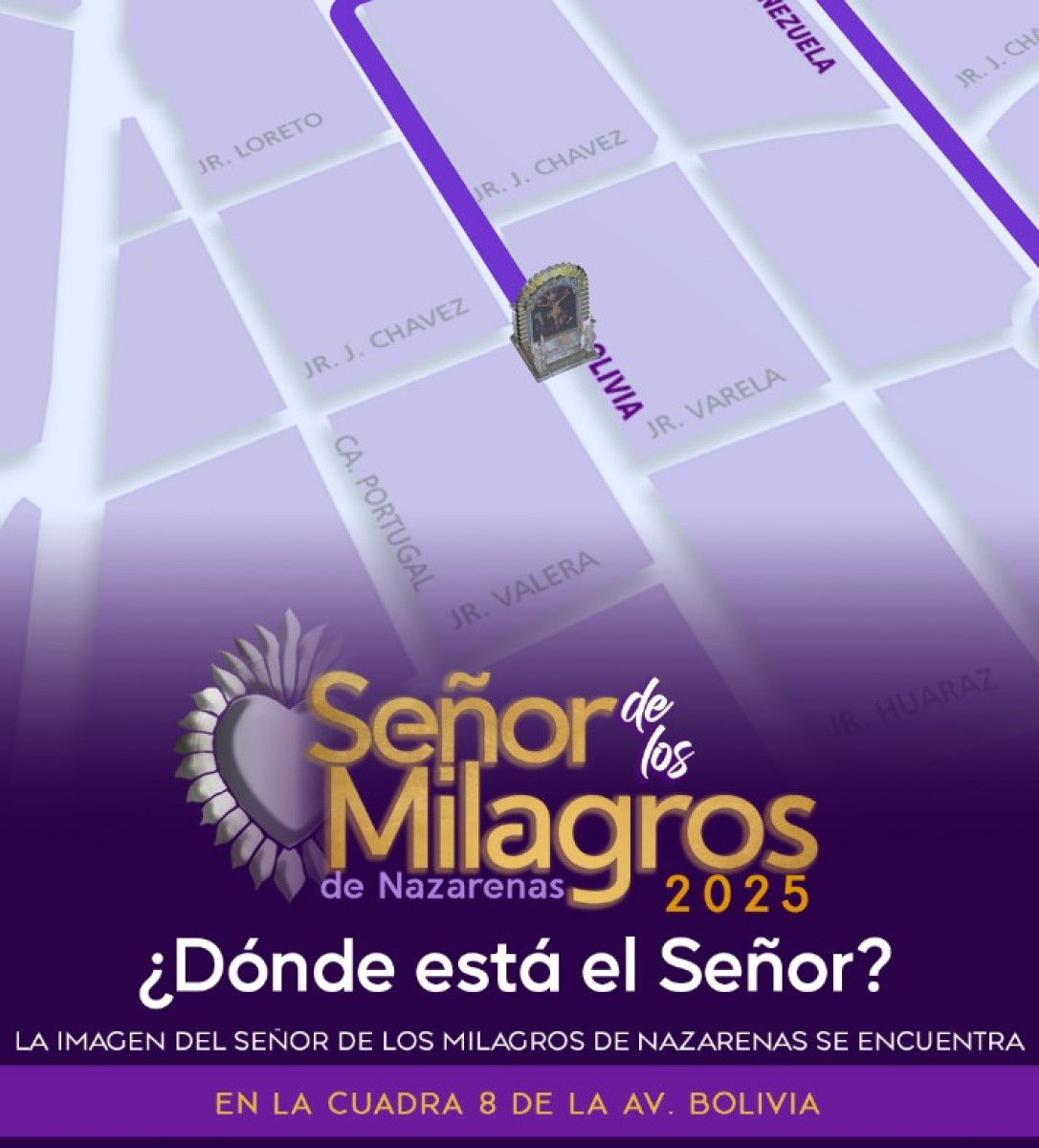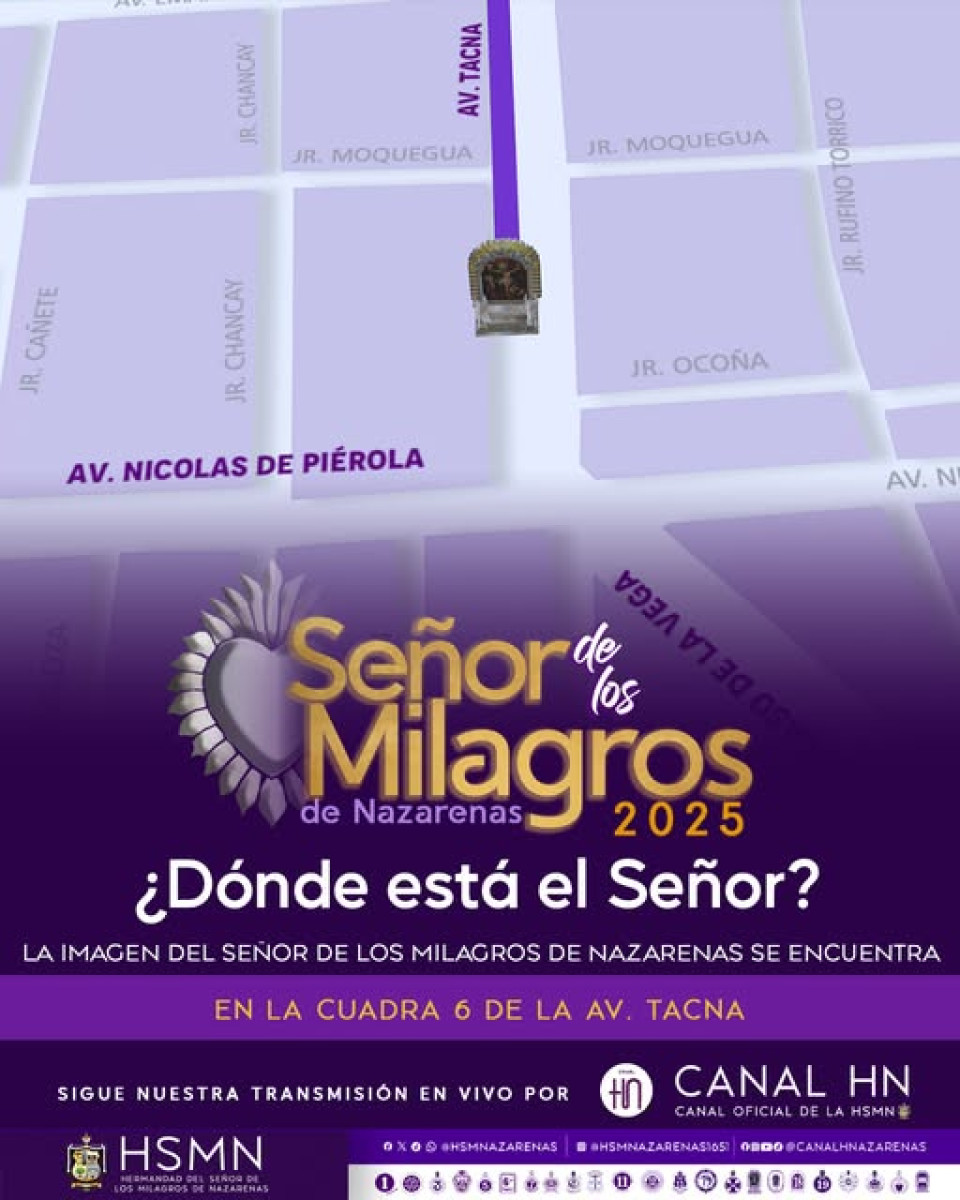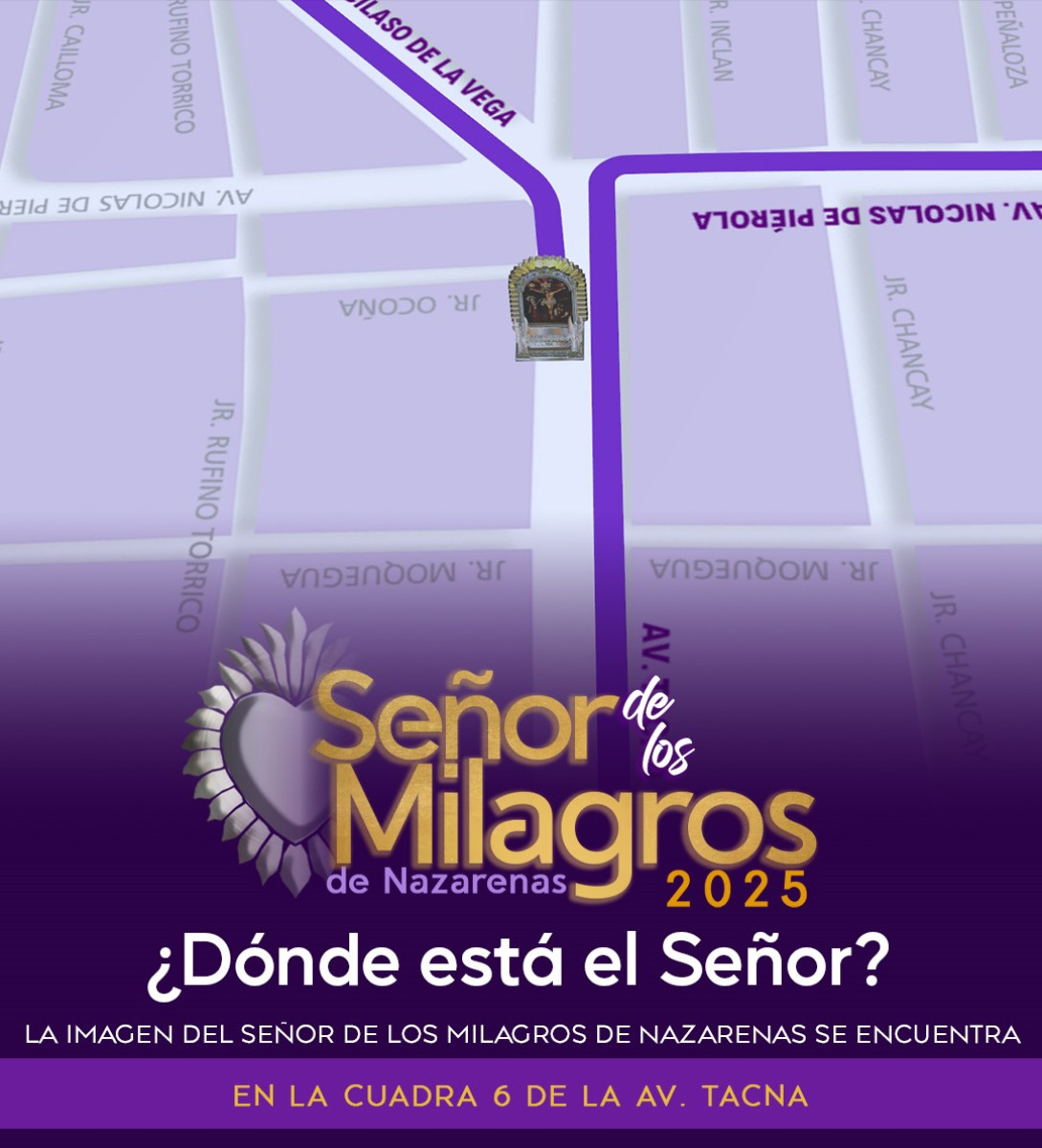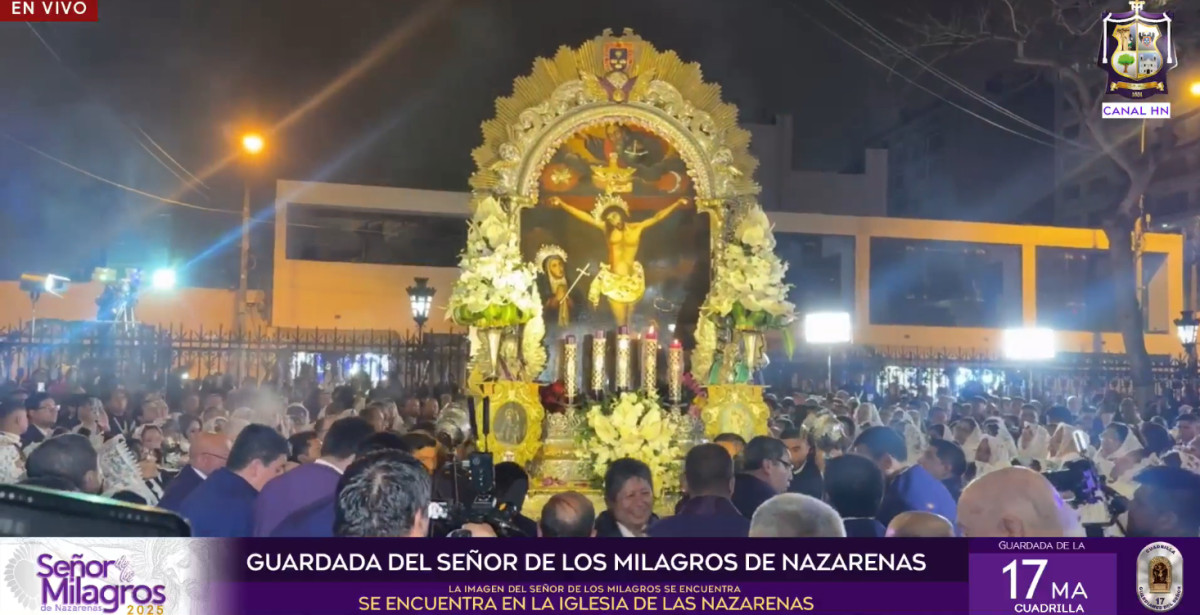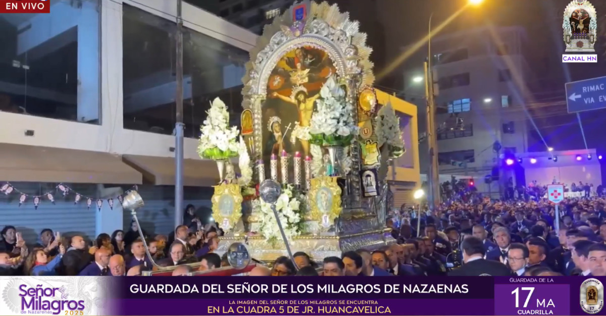 La imagen del Señor de los Milagros de Nazarenas se encuentra actualmente en la cuadra 6 de la Av. Tacna, en Lima, siguiendo su tradicional recorrido por las calles de la ciudad.