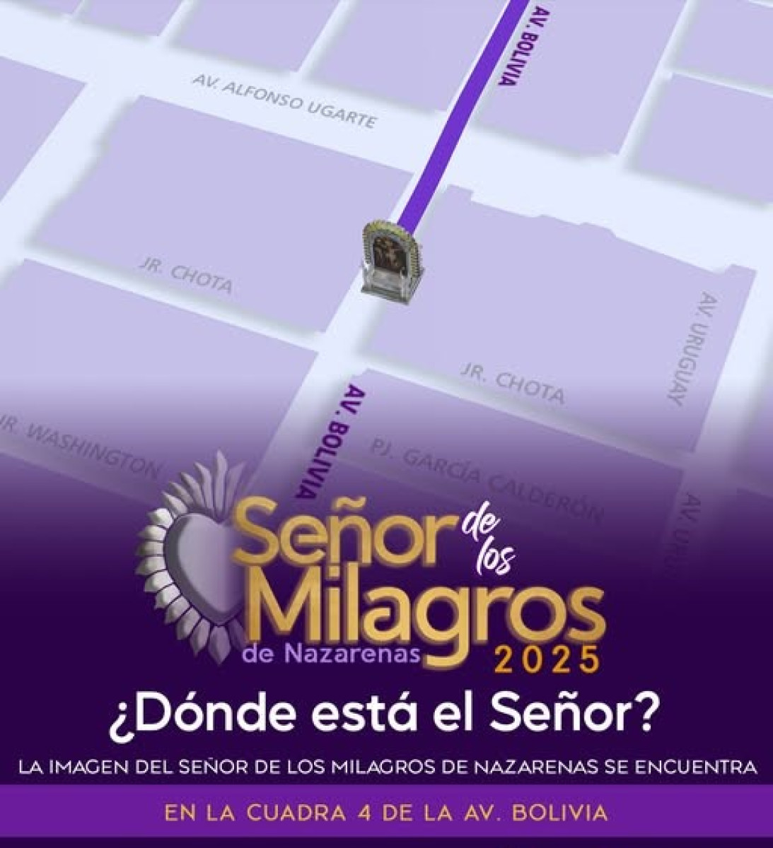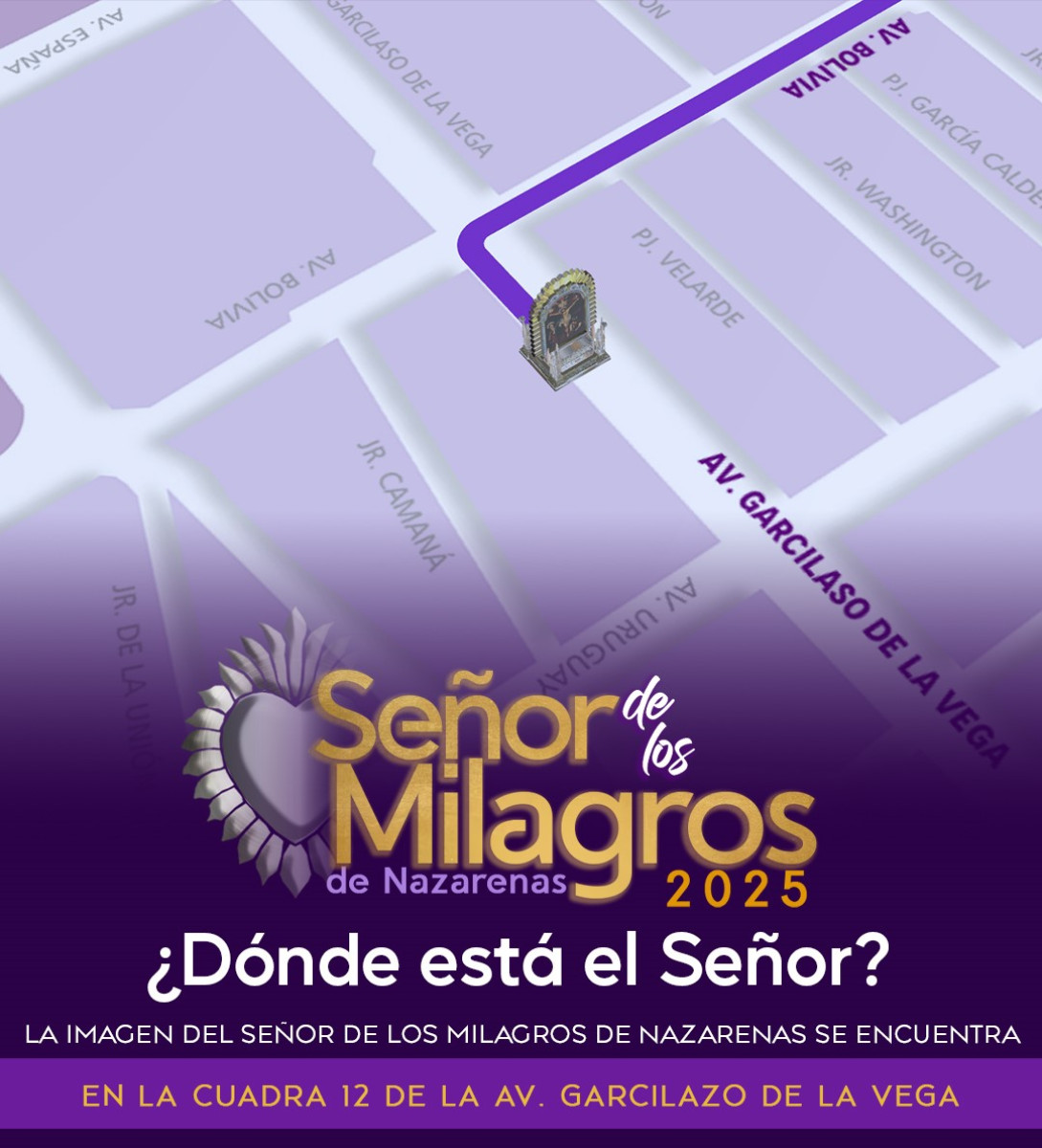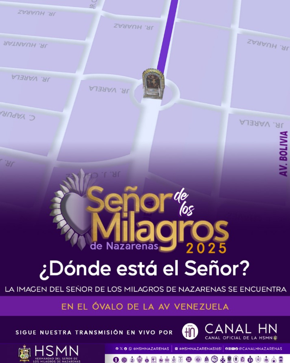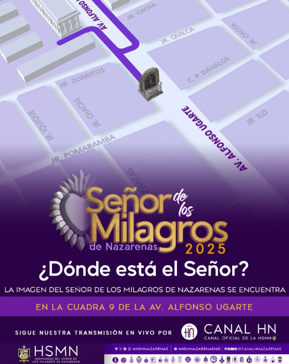Según el cronograma de la Municipalidad de Lima, la sagrada imagen del Señor de los Milagros partirá del Santuario de las Nazarenas a las 6 a.m. para recorrer la avenida Tacna, la avenida Nicolás de Piérola y el jirón Cañete. Luego continuará por la avenida Alfonso Ugarte hasta el Hospital Arzobispo Loayza para la bendición a los enfermos.