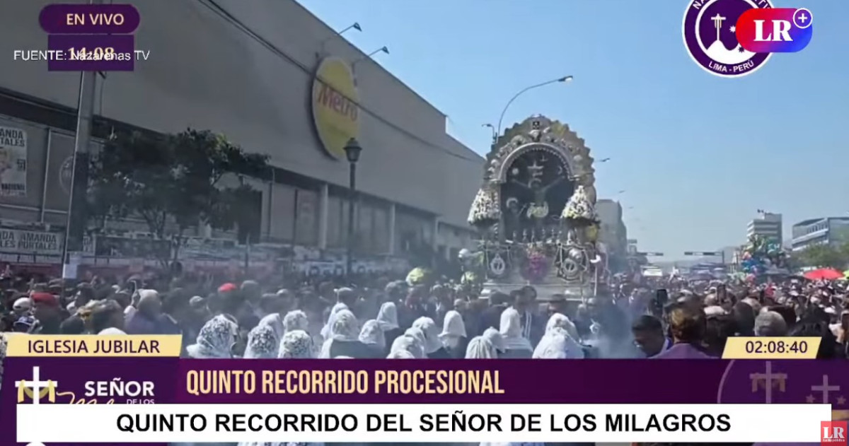 Este martes 28 de octubre, el Señor de los Milagros realizó su quinto recorrido por las calles de Lima. La procesión inició a las 6:00 a. m. desde el Santuario de las Nazarenas, y fue acompañada por miles de fieles en importantes avenidas. En esta penúltima fecha, visitó centros de salud como el Hospital Arzobispo Loayza, donde miles de fieles devotos acompañaron la sagrada imagen del Cristo Moreno.