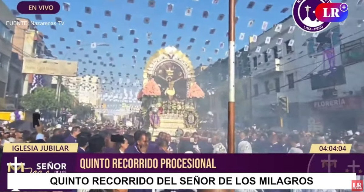 Este 28 de octubre, el Señor de los Milagros llevó a cabo su quinto recorrido en Lima, iniciando a las 6:00 a. m. desde el Santuario de las Nazarenas con la asistencia de miles de fieles.