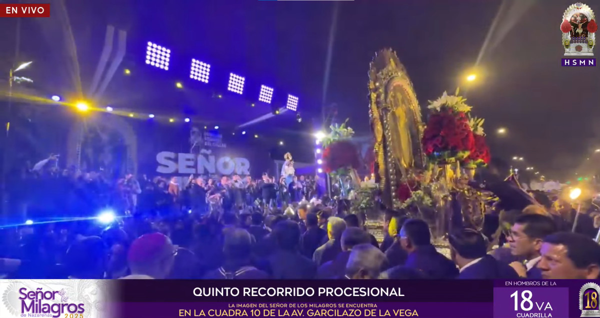 En estas horas de la madrugada, la imagen del Señor de los Milagros se encuentra en la cuadra 9 de la avenida Garcilaso de la Vega, en su quinto recorrido procesional.