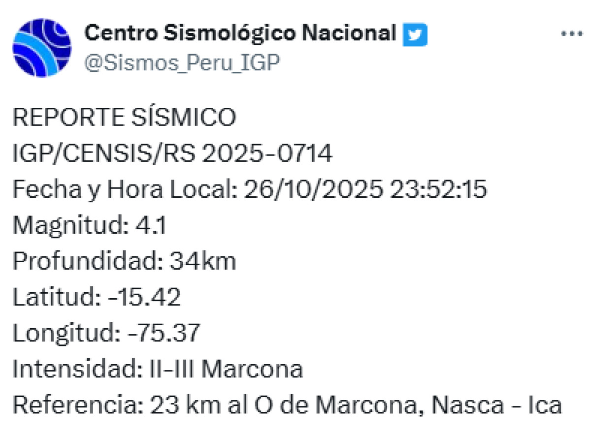 Un temblor de magnitud 4,1 se registró a las 23:52 p. m. a 23 kilómetros al oeste de Marcona, Nasca - Ica. El temblor del 26 de septiembre de 2025, se registró a una profundidad de 34 kilómetros, según informó el Instituto Geofísico del Perú (IGP) vía Twitter. Recuerda tener siempre lista una mochila de emergencia para estar preparado ante un desastre natural.
