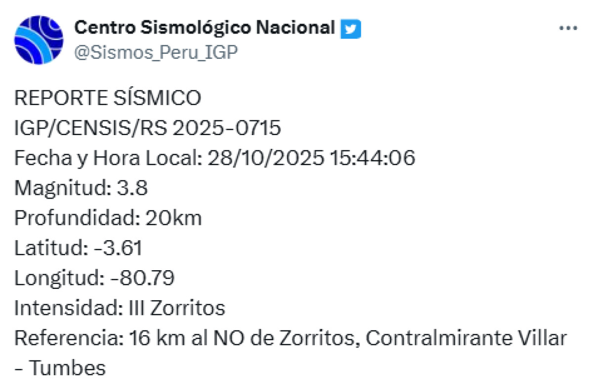 Un temblor de magnitud 3,8 se registró a las 03:44 p. m. a 16 kilómetros al noroeste de Zorritos, Tumbes. El temblor del 28 de octubre de 2025, se registró a una profundidad de 20 kilómetros, según informó el Instituto Geofísico del Perú (IGP) vía Twitter. Recuerda tener siempre lista una mochila de emergencia para estar preparado ante un desastre natural.