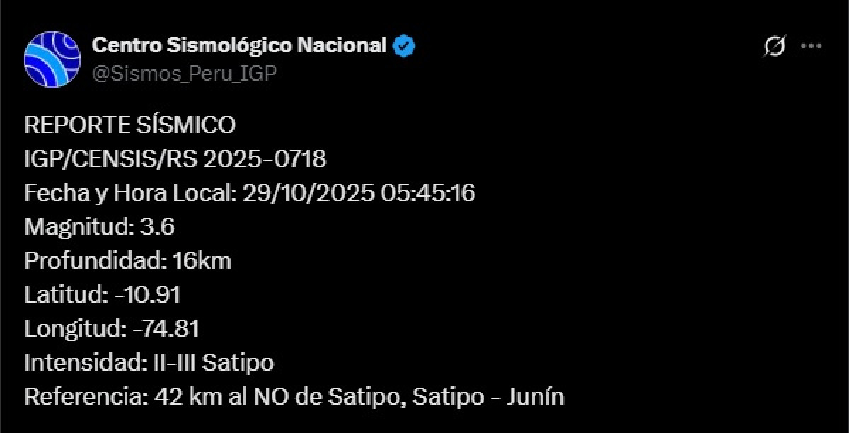 Un temblor de 3,6 grados de magnitud se sintió a las 05:45 a. m. en Satipo, Satipo, según reportó el IGP. El temblor tuvo una profundidad de 16 kilómetros y una referencia de 42 kilómetros al noroste de Junín.