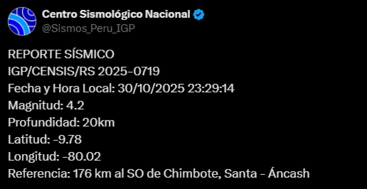 A las 23:29 p.m. de este jueves 30 de octubre, Áncash registró un sismo de magnitud 4,2. El epicentro se dio a 176 km al suroeste de Chimbote, Santa, según el Centro Sismológico Nacional.