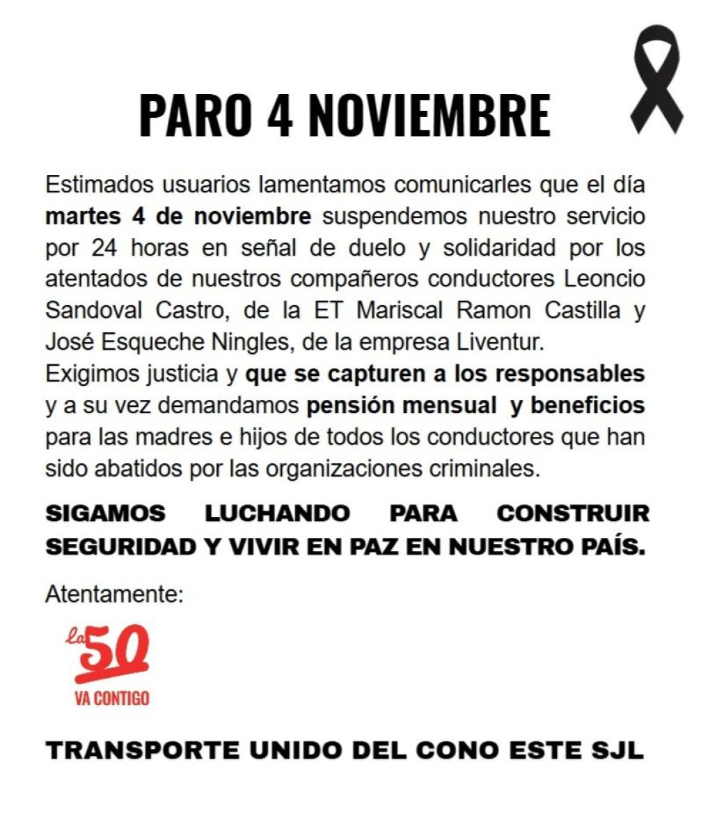 La empresa La 50 también confirmó que suspenderá su servicio el martes 4 de noviembre por 24 horas, en señal de duelo y solidaridad por los atentados contra los conductores Leoncio Sandoval Castro y José Esqueche Ningles. Asimismo, exigieron justicia, la captura de los responsables, y solicitaron una pensión mensual y beneficios para las madres e hijos de los conductores que han sido víctimas de organizaciones criminales.