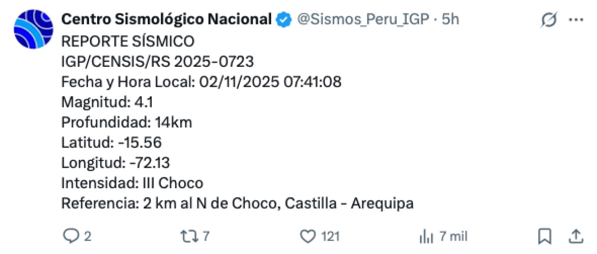 Un sismo de magnitud 4,3 se registró a las 07:41 a. m. 1 km al norte de Choco, Castilla en Arequipa. El temblor del 2 de noviembre de 2025, se registró a una profundidad de 14 kilómetros, según informó el Instituto Geofísico del Perú (IGP) vía X. Recuerda tener siempre lista una mochila de emergencia para estar preparado ante un desastre natural.