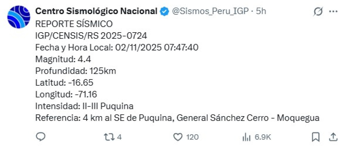 Un sismo de magnitud 4,4 se registró a las 07:47 a. m. 4 km al sureste de Puquina, General Sánchez Cerro en Moquegua. El temblor del 2 de noviembre de 2025, se registró a una profundidad de 125 kilómetros, según informó el Instituto Geofísico del Perú (IGP) vía X. Recuerda estar preparado ante cualquier movimiento telúrico.