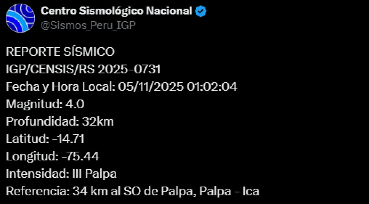 Un temblor de magnitud 4,0 se registró a la 01:02 a. m., a 34 kilómetros al suroeste de Ica. El movimiento telúrico de este, 5 de noviembre, tuvo una profundidad de 32 kilómetros, según informó el Instituto Geofísico del Perú (IGP) vía X.