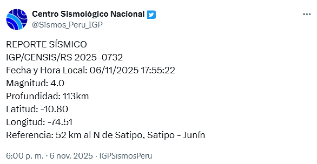 A las 05:55 a.m. de este jueves 6 de noviembre, Junín registró un sismo de magnitud 4,0. El epicentro se dio a 52 km al norte de Satipo, según el Centro Sismológico Nacional.
