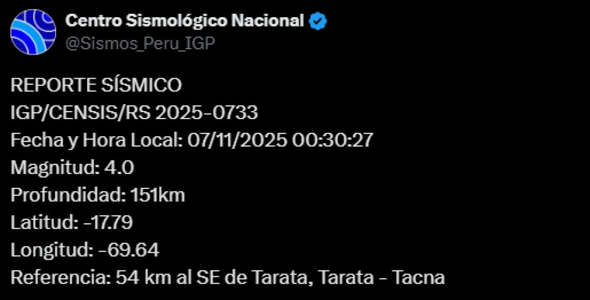 A las 00:30 a.m. de este viernes 7 de noviembre, Tacna registró un sismo de magnitud 4,0. El epicentro se dio a 54 km al sur este de Tarata, según el Centro Sismológico Nacional.