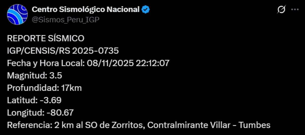 Un temblor de magnitud 3,5 se registró a la 22:12 p. m., a 2 kilómetros al suroeste de Zorritos, Contralmirante Villar. El movimiento telúrico de este, 8 de noviembre, tuvo una profundidad de 17 kilómetros, según informó el Instituto Geofísico del Perú (IGP) vía X.