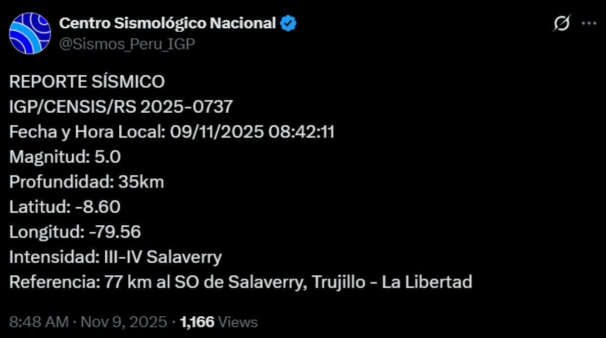 Un temblor de magnitud 5,0 se registró a las 8:42 a. m. a 77 kilómetros al suroeste de Salaverry, Trujillo. El temblor del 9 de noviembre de 2025, se registró a una profundidad de 35 kilómetros, según informó el Instituto Geofísico del Perú (IGP) vía Twitter. Recuerda tener siempre lista una mochila de emergencia para estar preparado ante un desastre natural.