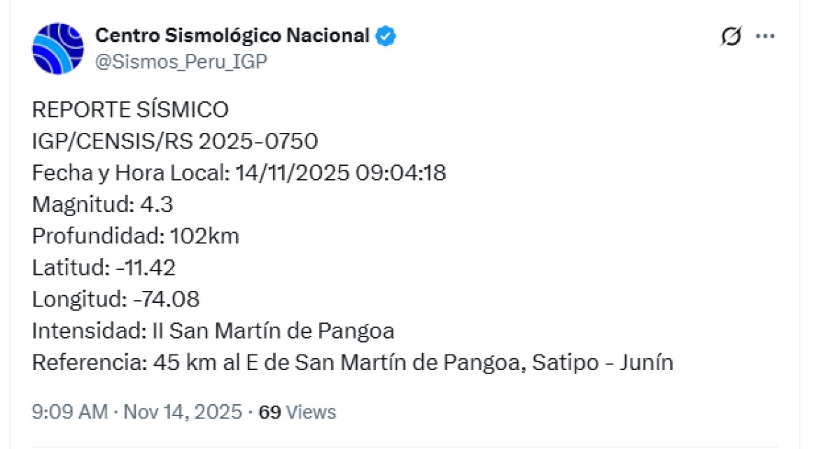 Un sismo de 4,3 de magnitud se registró hoy, 14 de noviembre a las 9:04 a.m. El epicentro del movimiento telúrico fue a 45 kilómetros al este de San Martín de Pangoa, Satipo.