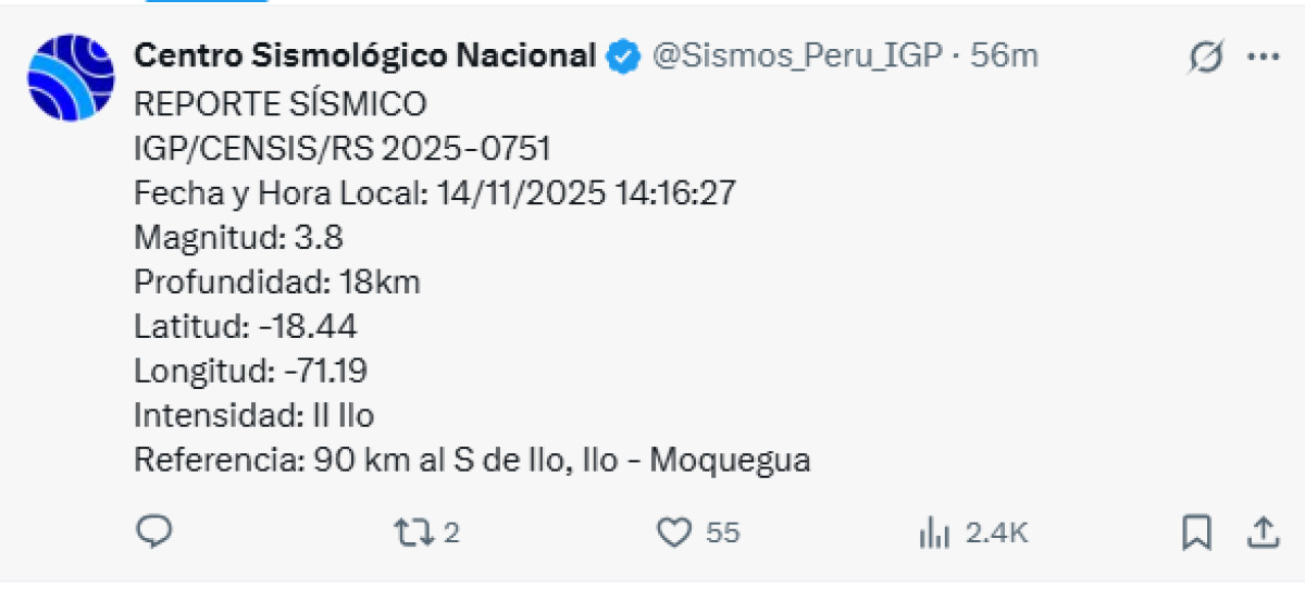 Un sismo de 3,8 de magnitud se registró hoy, 14 de noviembre, a las 2:16 p.m. en la ciudad de Moquegua. El epicentro del movimiento telúrico fue a 90 kilómetros al sur de Illo.