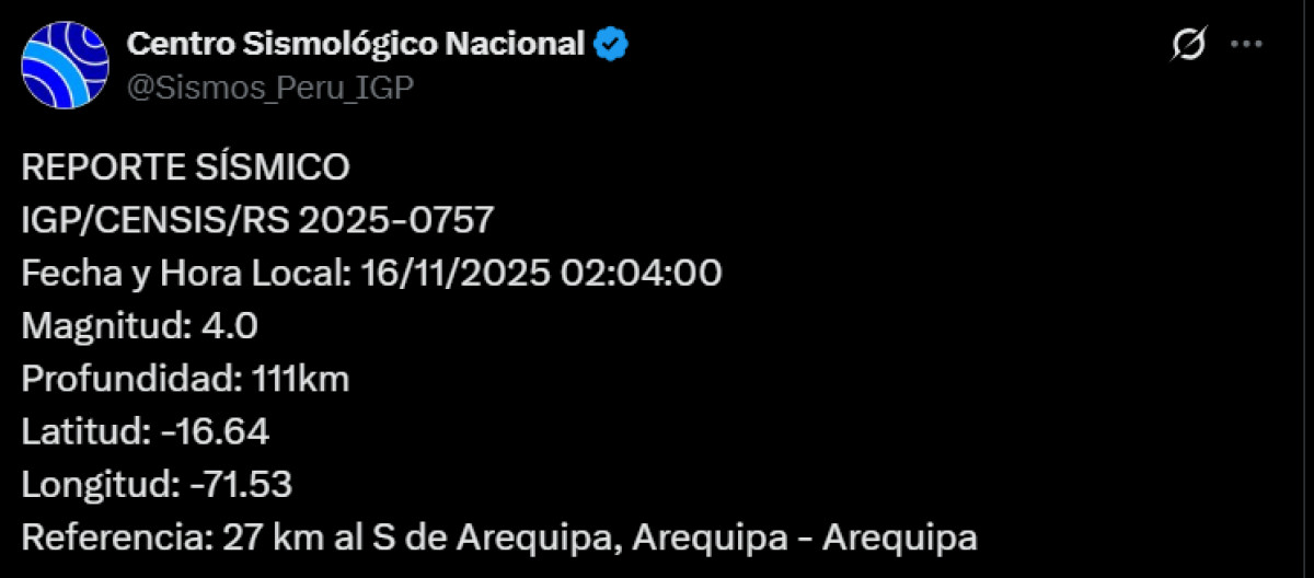 Un temblor de magnitud 4,0 se registró a la 02:04 a. m., a 27 kilómetros al sur de Arequipa, Arequipa. El movimiento telúrico de este 16 de noviembre tuvo una profundidad de 111 kilómetros, según informó el Instituto Geofísico del Perú (IGP) vía X.
