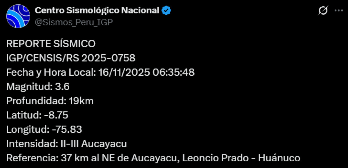 Un temblor de magnitud 3,6 se registró a la 06:35 a. m., a 37 kilómetros al noreste de Aucayacu, Leoncio Prado, en Huánuco. El movimiento telúrico de este 16 de noviembre tuvo una profundidad de 19 kilómetros, según informó el Instituto Geofísico del Perú (IGP) vía X.