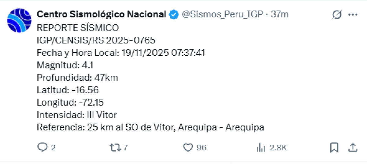 Un temblor de magnitud 4,1 se registró a las 07:37 a. m. a 47 kilómetros al suroeste de Vitor, Arequipa. El temblor de este 19 de noviembre, tuvo una profundidad de 47 kilómetros, según informó el Instituto Geofísico del Perú (IGP) vía Twitter. Recuerda tener siempre lista una mochila de emergencia para estar preparado ante un desastre natural.