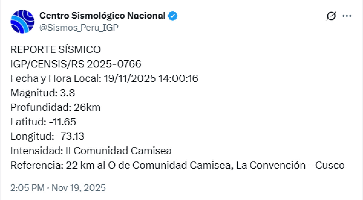 Un sismo de 3,8 de magnitud se registró el día de ayer, 19 de noviembre, en la región del Cusco. El epicentro tuvo lugar a 22 km al oeste de Comunidad Camisea, La Convención, según el Centro Sismológico Nacional.