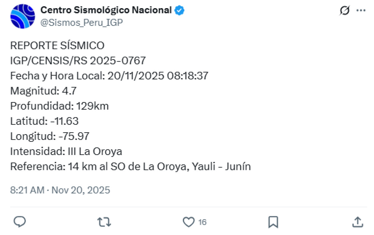 Temblor de HOY, jueves 20 de noviembre, en Perú: últimas noticias EN VIVO