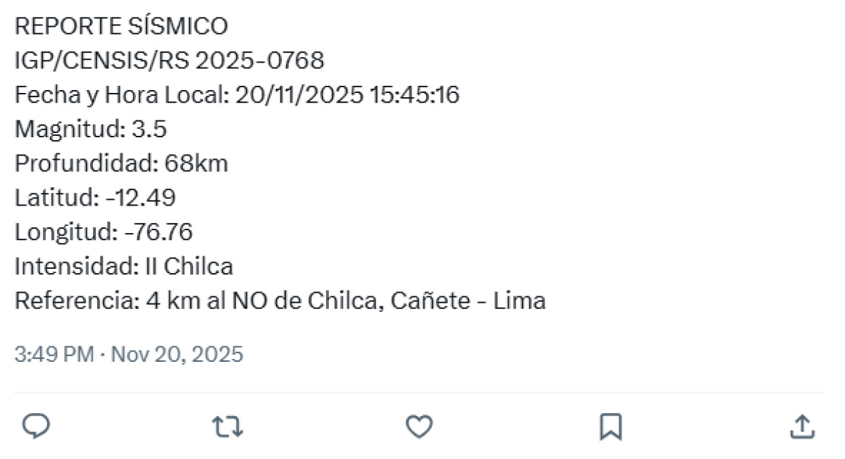 Temblor en Perú HOY, 20 de noviembre: ¿a qué hora y dónde ocurrió el último sismo vía IGP?