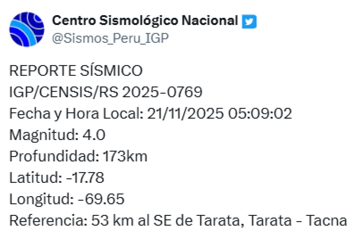Un temblor de magnitud 4,0 se registró a las 05:09 a. m. a 53 kilómetros al suroeste de Tarata, Tacna. El temblor del 21 de noviembre de 2025, se registró a una profundidad de 173 kilómetros, según informó el Instituto Geofísico del Perú (IGP) vía Twitter. Recuerda tener siempre lista una mochila de emergencia para estar preparado ante un desastre natural.