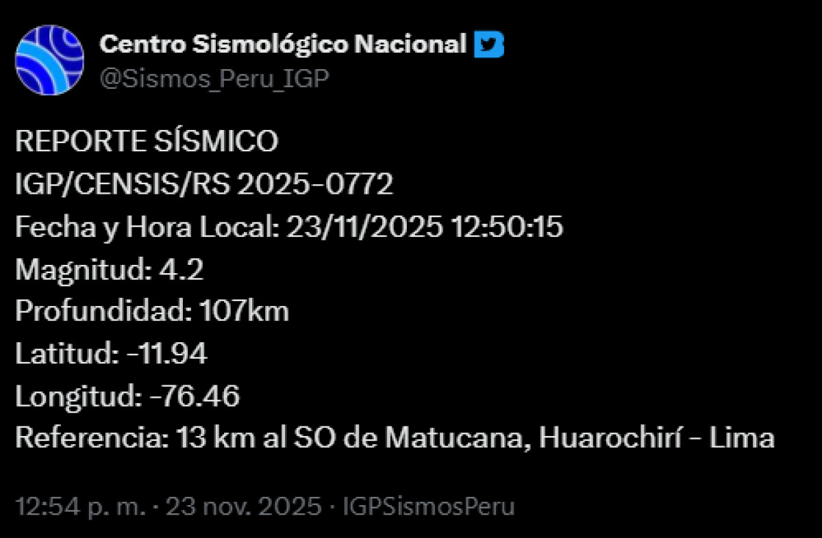 Un temblor de magnitud 4,2 se registró en Matucana, Lima este domingo 23 de noviembre a las 12.50 p. m., el movimiento tuvo una profundidad de 107 km.