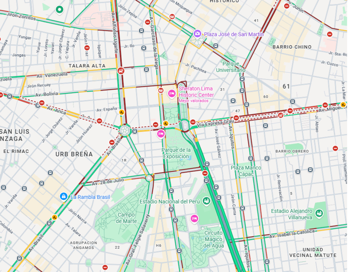 Las principales avenidas en el Centro de Lima que presentan congestión son la Av. Alfonso Ugarte, y parte de la Av. 28 de Julio, en especial en el tramo que colinda con el Parque de la Exposición. Foto: Google Maps.