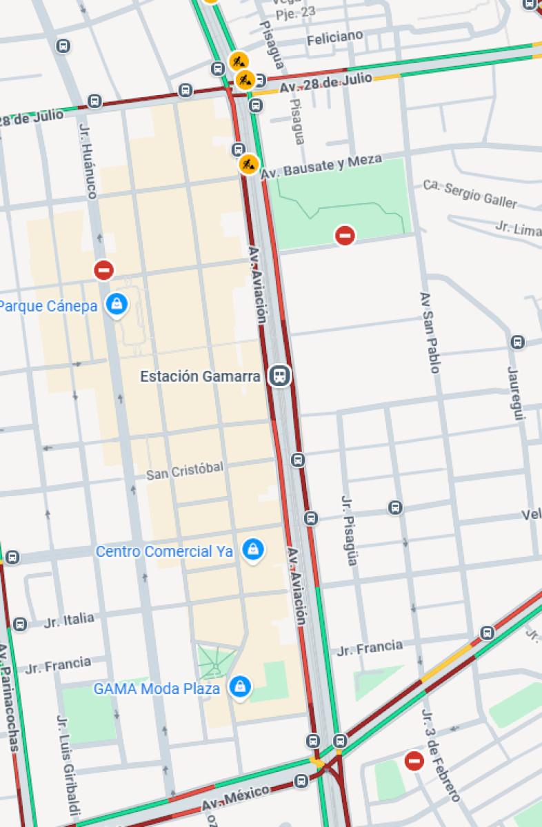 La avenida Aviación presenta un retraso de 6 minutos en su tránsito hacia las 2:30 p.m., cerca de la estación Gamarra de la línea 1 del Metro de Lima. Se reportan múltiples obras en la zona, como en el cruce con la Av. 28 de Julio y con la Av. Bausate y Meza. Foto: Google Maps.